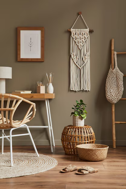 Contoh: Alih-alih memenuhi dinding dengan banyak hiasan, cukup gunakan satu atau dua macramé besar sebagai dekorasi utama. Bisa juga menambahkan cermin berbingkai rotan untuk memberikan kesan luas dan tidak sumpek.